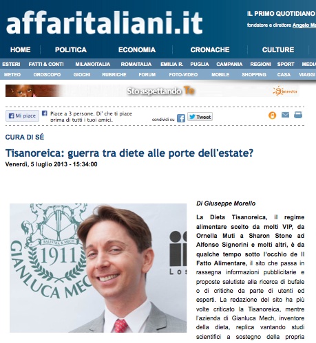 Gli articoli che abbiamo dedicato alla dieta Tisanoreica hanno attirato l’attenzione di Affari Italiani, un sito web che ha pubblicato un articolo con il titolo “Tisanoreica: guerra tra diete alle porte dell’estate?” in cui si critica il nostro sito per gli attacchi a questo modello di dieta. Nel servizio si intervista la psichiatra Emilia Costa, direttrice del Centro per i Disturbi della Condotta Alimentare del Policlinico Umberto I di Roma, che esprime un giudizio sostanzialmente positivo sul regime di Gianluca Mech, sottolineando gli investimenti in ricerca scientifica e la difesa dell’agroalimentare italiano (anche se è forse opportuno ricordare che il programma è in gran parte costituito da pasti in busta e surrogati, un elemento segnalato anche da un’indagine di Altroconsumo).