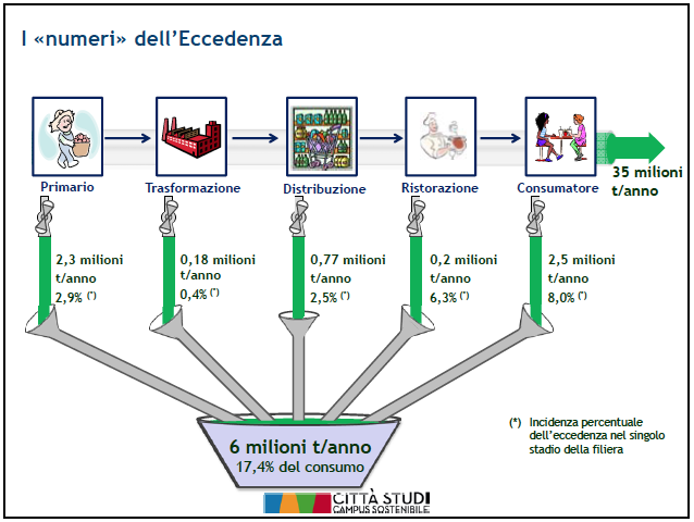 *L’indagine è stata effettuata a partire da diversi materiali: letteratura scientifica e studi governativi, interviste a 10 esperti della filiera agroalimentare, analisi di 124 studi di caso nei vari stadi della filiera, survey su un panel di 6.000 nuclei familiari e studio dell’organizzazione di alcune food banks impegnate nella raccolta delle eccedenze alimentari.