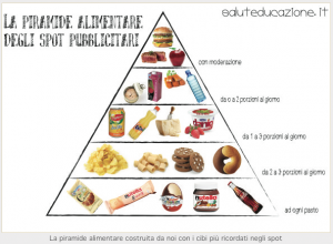 Grazie alla preziosa collaborazione con i professori di scienze e italiano, in ogni classe abbiamo svolto diverse attività per chiarire anche gli aspetti più controversi del cibo di cui ci nutriamo. Innanzitutto, abbiamo stravolto la piramide alimentare classica, costruendone una basata sugli spot più visti dai ragazzi. In questo modo, ognuno ha potuto vedere con i propri occhi come la pubblicità di alimenti e bevande porti con sé un equilibrio distorto di nutrienti, fortemente sbilanciato verso grassi, sale e zuccheri, perlopiù cibo spazzatura. In secondo luogo, abbiamo decostruito gli spot alimentari, mettendone in luce le finalità commerciali (non sempre chiare per ragazze e ragazzi di 12 anni) e tutte le tecniche (immagini, montaggio e musiche) che portano verso un consumo incontrollato di cibo fin dalla più tenera età.