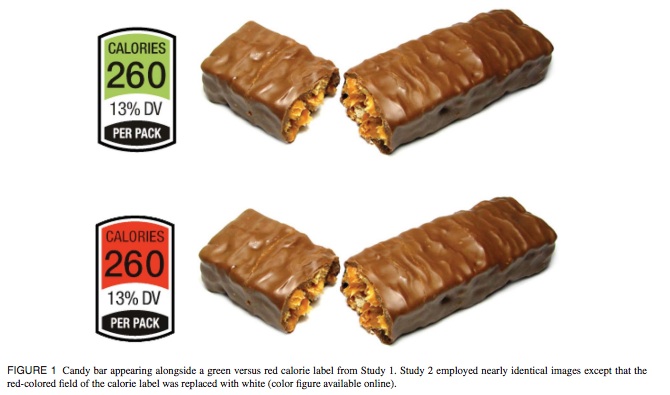 Il direttore del laboratorio ha strutturato in due fasi distinte l’indagine, pubblicata nel numero di febbraio di Health Comunication (Does green mean healthy? Nutrition label color affects perception of Healthfulness). Nella prima, ha chiesto a 93 volontari di immedesimarsi nel ruolo di una persona affamata mentre percorre il corridoio dei dolci di un supermercato. In seconda battutta ha mostrato loro l’immagine di una barretta al cioccolato. In alcuni casi, lo snack aveva un’etichetta verde con l’indicazione del contenuto calorico (260 kcal, pari al 13% della razione giornaliera), in altri la barretta aveva un’etichetta rossa, con le stesse informazioni.