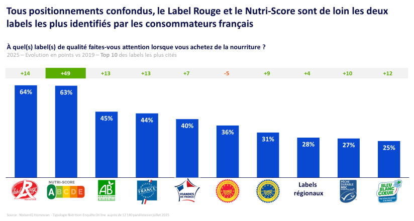 Il Nutri-Score è una delle etichette e dei loghi più riconosciuti dai consumatori francesi, al pari della Label Rouge, secondo l’indagine di Nielsen