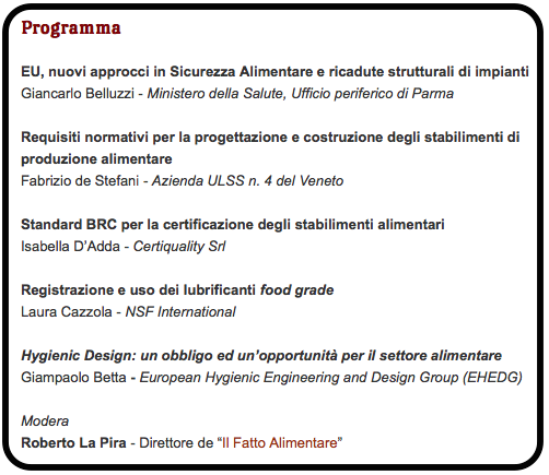 L’evento, inserito all’interno del 26° Salone internazionale della filiera della carne presso Veronafiere, offrirà degli spunti di riflessione sul rapporto tra igiene, tecnologia e redditività finale. Le macchine che consentono di raggiungere alti livelli di igiene e sicurezza sono spesso più costose rispetto a quelle tradizionali, ma quanto si guadagna – in termini di qualità e prestazioni – applicando le norme e andando oltre? A questo e ad altri questi si cercherà di rispondere durante l’incontro in cui, con l’intervento di Fabrizio de Stefani si parlerà anche degli approcci dell’Unione europea in merito alla sicurezza, dei requisiti normativi per progettare e costruire stabilimenti, dei lubrificanti food grade e delle opportunità date da questi obblighi collegati alla sicurezza. (Scarica la Locandina)