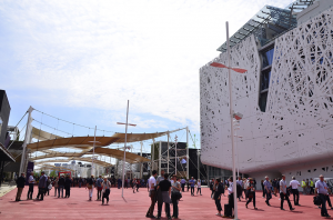 Davanti a Palazzo Italia c’è il padiglione dell’Unione europea, che, per fortuna, non ha seguito la stessa impostazione e per fortuna ha scelto di non dare spazio ad ognuno dei ventotto paesi che la compongono. Il tema di expo viene raccontato attraverso la storia d’amore tra una scienziata e un agricoltore, l’unione tra il sapere e il saper fare, tra innovazione e tradizione. Lo stile narrativo è quello del cartone animato proiettato in due sale: nella prima si vedono però immagini statiche seguita da effetti speciali nella seconda. All’uscita, alcuni pannelli interattivi riprendono il filone della storia per parlare di agricoltura sostenibile, sicurezza alimentare, sanità animale. L’afflusso dei visitatori non è alto ma il gradimento pare buono, anche di fronte ai pannelli.