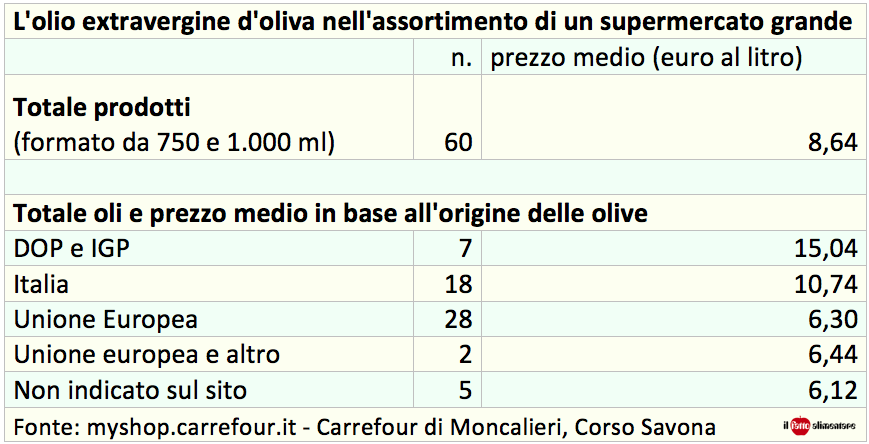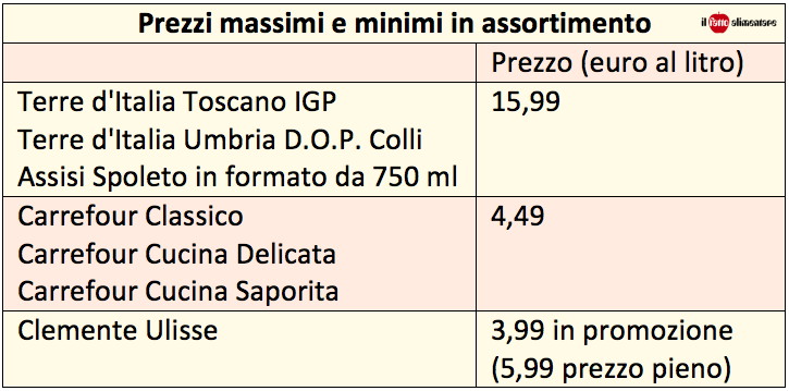 Per quanto riguarda il prezzo ci sono ampie differenze a seconda dell’origine, italiana o dell’Unione Europea. I più costosi sono i DOP con un 15 €/l. L’olio italiano ha un prezzo che si aggira sugli 11 € mentre le miscele dell’UE scendono a 6,30. La differenza fra il prezzo massimo, 15,99 €/l, e quello minimo, 3,99 proposto da Clemente Ulisse in promozione è molto ampia. La bottiglia più economica costa ¼ del più caro. Escludendo questo olio in promozione, gli altri più economici sono tutti con la marca commerciale Carrefour e vengono venduti a 4,49 €/l.
