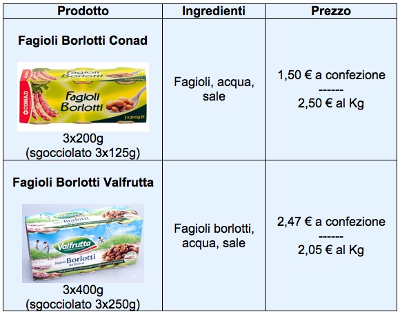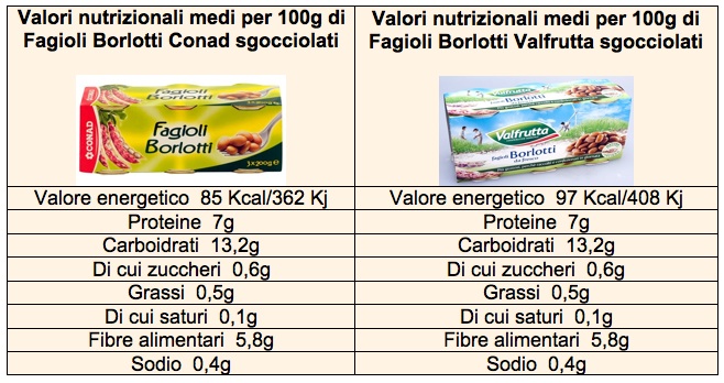 Il Fatto Alimentare ha confrontato i fagioli borlotti in scatola Valfrutta nella confezione di tre pezzi da 400g, prodotti nello stabilimento di Alseno di Conserve Italia, con l’omologo Conad nel formato tre pezzi da 200g, confezionato dalla stessa azienda nella medesima località. Al supermercato si possono trovare anche scatole in Tetra Pak e in vasetto di vetro. La presenza di diversi formati e imballaggi sugli scaffali fa pensare ad una differenziazione dei prodotti ma l’aspetto più rilevante è la materia prima.