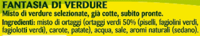 Dalla descrizione fornita nella sua lettera, riteniamo che si riferisca al prodotto in conserva chiamato “Fantasia di verdure”. Sull’etichetta del prodotto gli ingredienti sono riportati secondo la seguente terminologia: misto di ortaggi (ortaggi verdi 50% (piselli, fagiolini verdi, fagiolotti verdi), carote, patate), acqua, sale, aromi naturali (sedano). Il termine “verdure” non compare nella lista degli ingredienti, come invece da Lei segnalato.