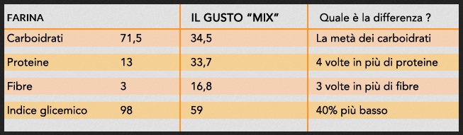 Il segreto della farina “magica“ è da ricercare nel diverso apporto nutrizionale rispetto a quella classica. La tabella proposta nel sito internet fa una comparazione tra i nutrienti che però risulta alquanto strana. I dati inseriti nella colonna di destra non sembrano molto corretti sia per quanto riguarda le proteine sia per le fibre. A parte questi errori grossolani dove il triplo di fibre e il quadruplo di proteine non coincidono con i numeri inseriti, nella tabella manca l’apporto calorico. Basta confrontare questo valore (322Kcal/ 100g) indicato su un’altra parte dell’etichetta con quello della farina tradizionale di frumento 00 (340Kcal/ 100g: dati Inran) per rendersi conto che la diminuzione delle calorie è di circa il 6%. Forse si tratta di un valore troppo piccolo per dimagrire.