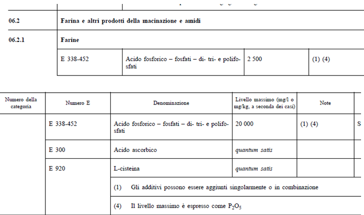 È vero che la farina è attualmente ancora regolata dal DPR 187/2001 e che l’art. 2 del d lgs. 109/92 (ripreso comunque dall’art.7, comma c del Reg. (UE) 1169/2011 in vigore da dicembre 2014) vieta di affermare che il prodotto possieda caratteristiche particolari rispetto a prodotti analoghi. Non è vero però che tutte le farine in commercio siano prive di additivi, il cui uso deve osservare il Reg. (CE) 1338/2008. Questo decreto consente l’aggiunta di ac. Fosforico – Fosfati, di-tri e polifosfati (E338-452, «agenti lievitanti»), ma anche di acido ascorbico (E300) e L-Cisteina (E920) che generalmente rientrano nella categoria «agenti di trattamento delle farine».