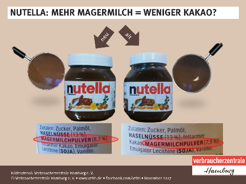 Nella lista degli ingredienti della Nutella venduta in Germania con la nuova formulazione sparisce il siero di latte in polvere e aumenta la quantità di latte scremato in polvere, che passa dal 7,5% all’8,7%, superando il cacao magro per quantità. Questo cambiamento si riflette anche in una leggera variazione dei valori nutrizionali: aumentano gli zuccheri semplici dal 55,9% al 56,3% e diminuiscono i grassi dal 31,8% al 30,9%.