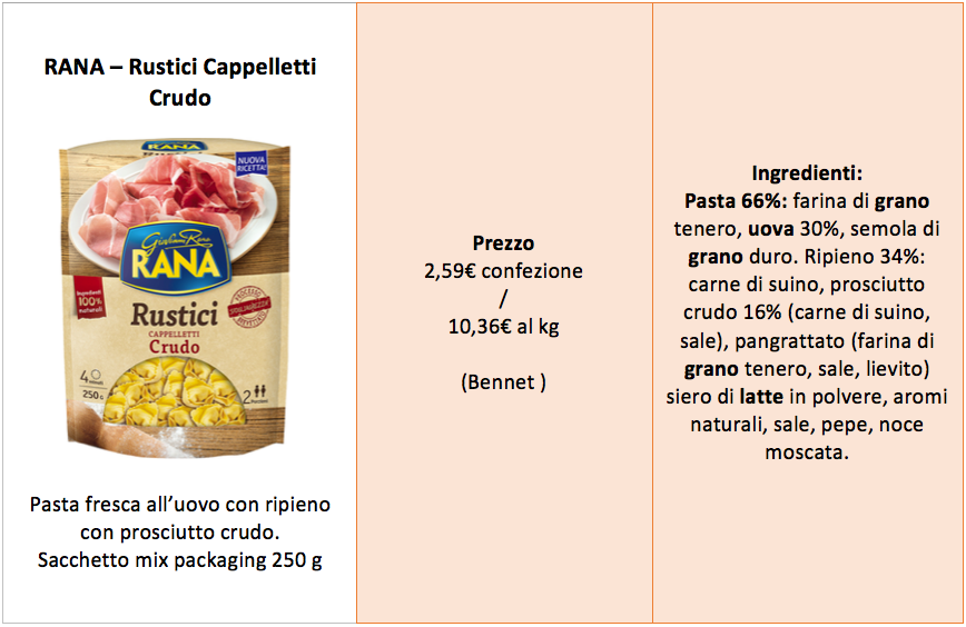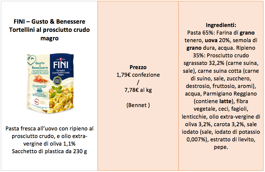 Per quanto riguarda gli ingredienti alcune differenze saltano all’occhio: la percentuale di prosciutto crudo, doppia nei tortellini Fini (32% contro 16%) la presenza di fibra vegetale e, soprattutto, di ceci, fagioli, lenticchie, carote e olio extravergine di oliva. Per quanto riguarda le uova i ruoli si invertono 30% nella pasta Rana e 20% in quella Fini.