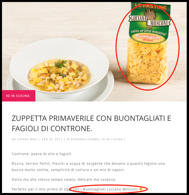 La famosa food blogger Chiara Maci sul sito non ha una sezione dedicata agli sponsor e nelle ricette non dice se è presente un contenuto pubblicitario. Il prodotto sponsorizzato però è spesso ben visibile nella foto e nella presentazione del piatto e viene nominato nella lista degli ingredienti, come si vede nella foto qui sopra. La presenza di una collaborazione con un’azienda può risultare palese agli addetti ai lavori e a una parte del pubblico, ma non è certo sufficiente. Per correttezza la blogger dovrebbe indicare chiaramente la sponsorizzazione, come fanno altri.