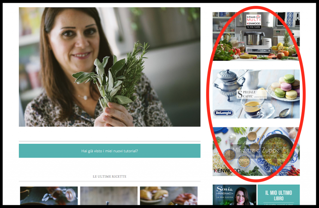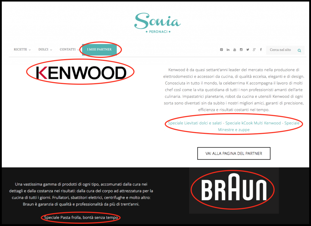 Sonia Peronaci raccoglie tutti i suoi sponsor in un’apposita pagina del sito web chiamata “I miei partner” (vedi foto sopra), dove indica l’elenco degli inserzionisti, come ad esempio i marchi di elettrodomestici Kenwood e DeLonghi o i prodotti ittici norvegesi Norge. In più, per ogni sponsor vengono riportate le ricette speciali, frutto della collaborazione.