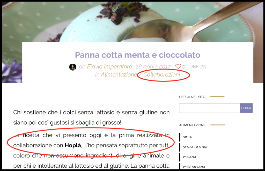 Il sito Mysia.info Magazine dichiara la collaborazione con un’azienda nel testo della ricetta