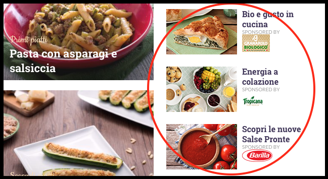 Sul sito GialloZafferano le ricette sponsorizzate sono collocate in un apposito riquadro nella colonna a destra della home page, dove appare anche il logo dell’azienda e la scritta “sponsored by”, come si nota nella foto sopra.