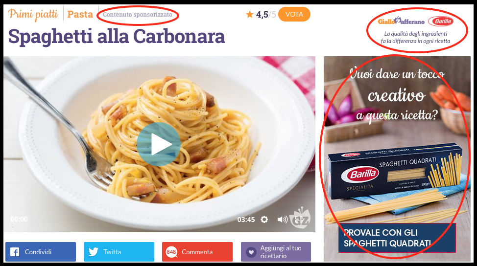 Quando una ricetta è sponsorizzata, il sito lo segnala anche riportando la scritta “contenuto sponsorizzato” (vedi foto sopra) e affiancando la dicitura con il logo dell’azienda e quello del sito, uno accanto all’altro. Oltre a ciò il prodotto pubblicizzato compare anche in fotografia (in questo caso la foto della pasta Barilla).