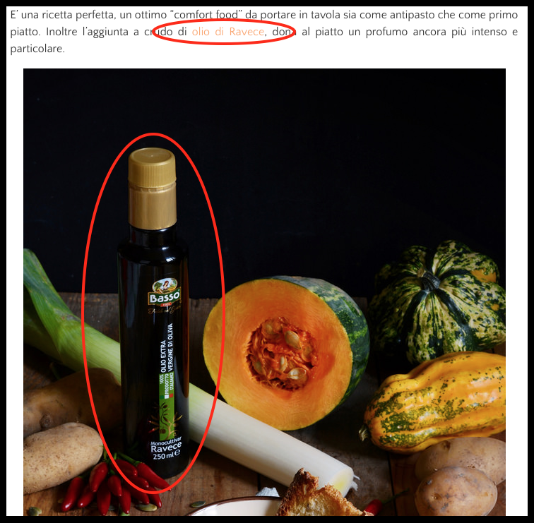 In questa ricetta, la blogger nomina un certo olio o lo rappresenta in fotografia, ma non dichiara chiaramente la collaborazione con l’azienda