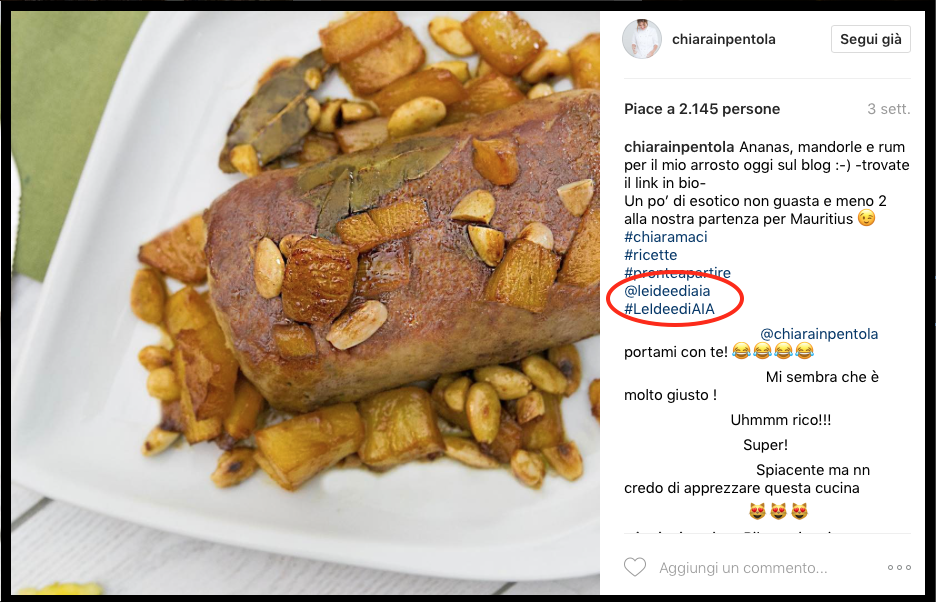 Nel caso rappresentato nella foto qui sopra, la blogger di Farina, lievito & fantasia, non dichiara in maniera esplicita la presenza di un accordo commerciale, ma nomina il prodotto di un’azienda, protagonista e lo mostra anche nella fotografia.