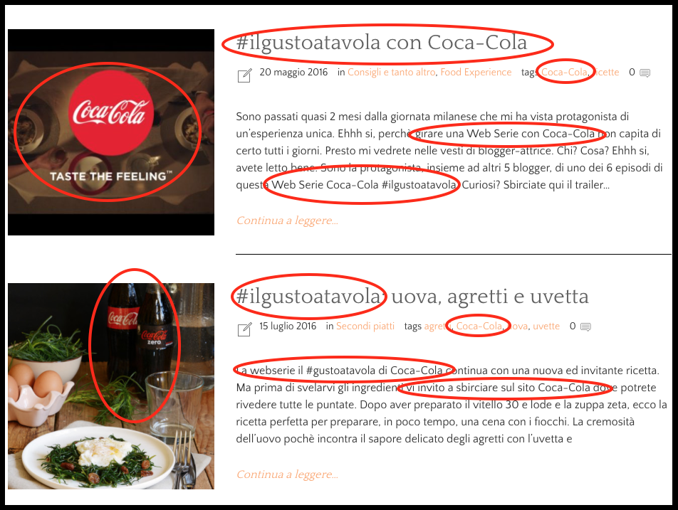 Nel blog Farina, lievito & fantasia gli inserzionisti con cui la blogger collabora sono raccolti in un’apposita sezione, chiamata “collaborazioni”. Tuttavia, a una veloce esplorazione del blog, la lista degli sponsor non sembra completa. Come si può vedere nella foto sopra, la blogger ha realizzato alcuni articoli in collaborazione con la Coca-Cola oltre che una serie di videoricette (una web serie) pubblicata sul sito dell’inserzionista. In questo caso lo slogan della campagna pubblicitaria è presente nel titolo del post preceduto da un hashtag (#nomecampagna) e il prodotto è sempre rappresentato nelle immagini e nella ricetta. Inoltre nel testo dell’articolo la collaborazione con l’azienda viene sempre dichiarata in maniera esplicita.