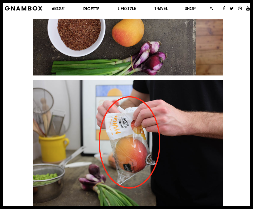 Nel sito Gnambox le ricette sponsorizzate non sono raccolte in un’apposita sezione, come fanno altri blogger. Gli autori si limitano a inserire il nome e la marca del prodotto sponsorizzato nel testo, nell’elenco degli ingredienti e nel procedimento fotografico, come si può vedere nell’immagine qui sopra, senza però metterlo bene in vista al centro della scena nella foto principale del piatto, come fanno altri food blogger.