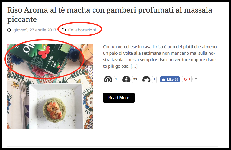 Il sito Misya.info, nella versione Magazine, raccoglie le ricette e gli articoli sponsorizzati nella sezione “collaborazioni”. C’è di più, in ogni ricetta è visibile la dicitura “collaborazioni” posizionato sotto il nome (nella foto sopra). Il prodotto sponsorizzato spesso è presente in fotografia o è nominato nel titolo, oltre che nel testo, come si vede nell’immagine qui sopra.