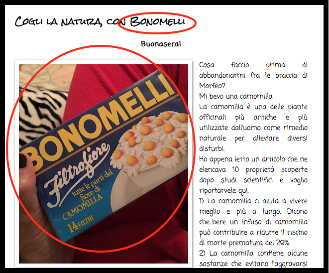 Nel blog Dolcezze di Nonna Papera si trovano casi molto dubbi in cui non si capisce se il prodotto sia sponsorizzato o meno, come con questa camomilla