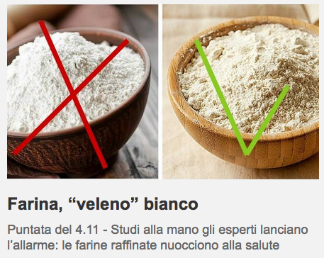 L’epidemiologo Franco Berrino intervistato nel servizio “Farina “veleno” bianco” del programma “Piatti chiari” del 4 novembre 2016 dalla tv svizzera italiana, ha accusato la farina bianca di essere nociva e di favorire diverse patologie come il diabete e persino tumori. La cosa desta una certa perplessità, perché la farina bianca viene assunta ogni giorno da milioni di italiani quando mangiano: pane, brioche, biscotti, pizze, cracker, focacce… Berrino (*), noto al pubblico italiano per le frequenti apparizioni televisive, non lascia spazio alla fantasia sulla nocività del prodotto. Concetti simili vengono ribaditi anche da Anna Villarini, ricercatrice dell’Istituto Nazionale dei Tumori che successivamente rilancia il pensiero del professore, per cercare di convincere i telespettatori a consumare solo farina integrale.