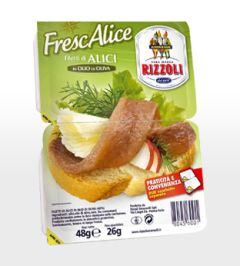 La Rizzoli,  n’azienda specializzata nel settore delle conserve ittiche, propone una nuova confezione di filetti di alici in olio di oliva, caratterizzata da piccole porzioni in vaschetta. L’intento è  di aumentare le occasioni di consumo. Il prodotto si presenta in due versioni: filetti in olio di oliva e filetti in salsa piccante. Il produttore sull’etichetta propone una sorta di “consumo veloce, quando scatta la voglia, magari insieme agli amici” e suggerisce una ricetta, in questo caso di appetizer.
