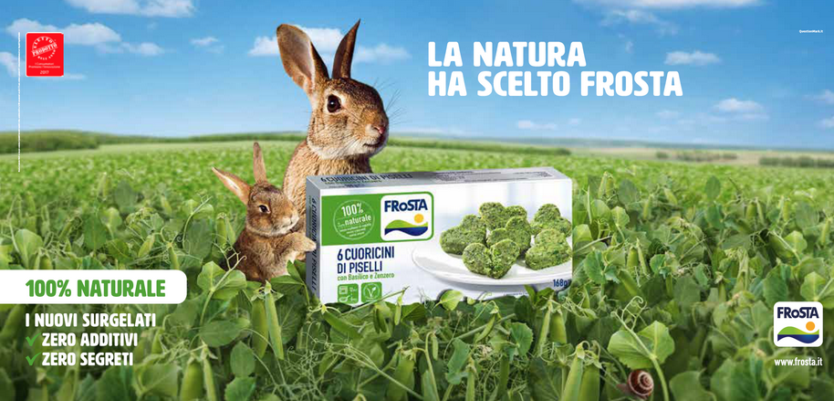 In uno dei manifesti si vedono due conigli affiancati dalla frase “La natura ha scelto Frosta” e dai claim: “100% naturale” “i nuovi surgelati”, “zero additivi” e “zero segreti”. La segnalazione è stata fatta dalla Compagnia surgelati italiana Spa (Csi), che ha percepito nell’espressione “nuovi surgelati”, una comparazione denigratoria nei confronti di altri prodotti simili. Secondo la Csi la dicitura potrebbere generare nel consumatore l’idea che si tratti di una categoria alimenatre nuova, con caratteristiche diverse dai tradizionali surgelati. L’azienda ha giustificato la presenza del claim sia perché il prodotto è stato presentato da poco sul mercato sia per la scelta di utilizzare ingredienti naturali.