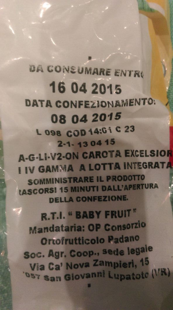 Sono un genitore rappresentante  della mensa di una scuola elementare di Padova che ha aderito al programma europeo “Frutta nelle scuole”, introdotto dal regolamento (CE) n.1234 del Consiglio del 22 ottobre 2007 e dal regolamento (CE) n. 288 della Commissione del 7 aprile 2009. La frutta o verdura porzionata consegnata a scuola ai bambini è confezionata in contenitori di plastica. Pochi giorni fa sono state distribuite sacchetti di carote pronte da consumare con un’etichetta dove viene specificato che l’alimento deve essere consumato DOPO che siano trascorsi 15 minuti dall’apertura (vedi foto sotto). Questa dicitura è prevista  nel bando di gara redatto dal Ministero delle politiche agricole e viene  obbligatoriamente  applicata dal fornitore). Ora, da madre e da persona di buon senso, mi chiedo: è opportuno che queste confezioni vengano consegnate a bambini che non sanno neanche leggere?