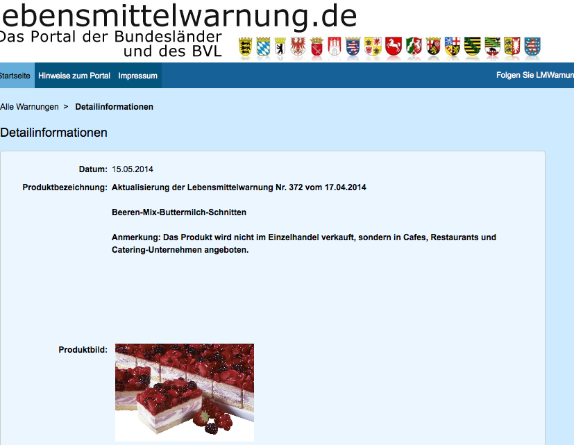 Il sistema di allerta alimentare tedesco ha diffuso una nota il 17 aprile in cui annuncia il ritiro cautelativo di una torta ai frutti di bosco per sospetta contaminazione dal virus dell’Epatite A. La torta non è in vendita nei supermercati ma è abitualmente distribuito nei bar, nei ristoranti e nelle collettività (ospedali, scuole, mense aziendali…). L’azienda coinvolta nella vicenda (Erlenbacher Backwaren GmbH) ha ritirato immediatamente il prodotto e ha diramato un comunicato invitando bar, ristoranti e altre strutture a non usare la torta ancora presente nei freezer trattandosi di un prodotto surgelato). A distanza di un mese è uscito un comunicato in cui si dice che in un campione di torta esportato dalla stessa ditta in Norvegia è stato riscontrato il virus dell’epatite A e quindi si conferma la validità dell’allerta e del ritiro.