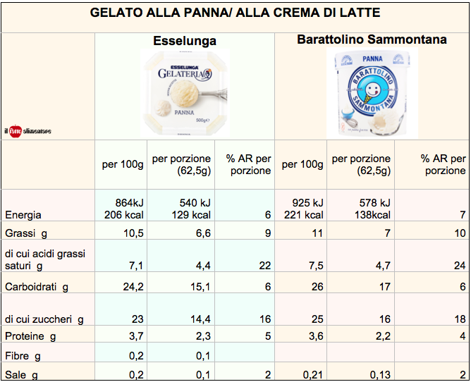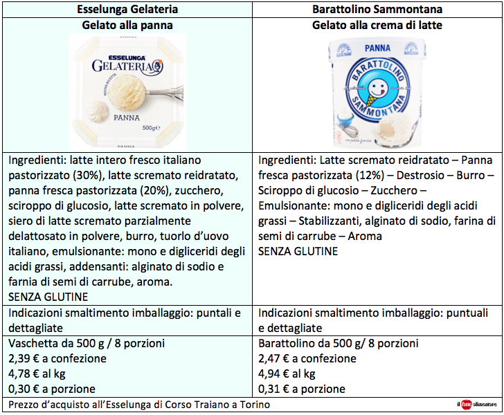 Nel gelato proposto da Esselunga Gelateria, la percentuale di panna fresca pastorizzata è del 20% mentre nell’analogo gelato Barattolino Sammontana la quantità è solo del 12%. A questa differenza corrisponde anche una ricetta diversa.