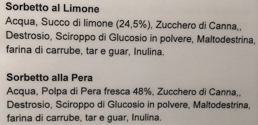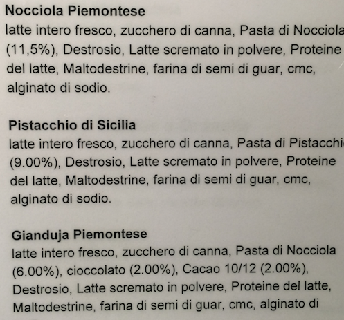 Diverso il caso invece dell’uso di additivi stabilizzanti (dalla cmc alla farina di carruba, ecc) che in effetti in queste ricette sono presenti in tante tipologie diverse ma non è possibile stabilire dalla lista ingredienti se sono quantitativamente meno della media degli altri gelati artigianali.
