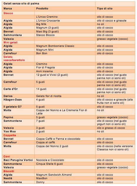 In alcuni gelati la presenza dell’olio di palma è limitata alla copertura di simil cioccolato presente nei ricoperti Bennet e nei coni Carrefour oppure nel biscotto o nella cialda di Ringo e Oreo. Considerando che il gelato è sempre stato fatto con il latte e l’aggiunta di panna, è lecito ritenere la presenza di altri grassi vegetali una caratteristica tipica del gelato industriale, forse interessante da un punto di vista tecnologico, ma non certo in linea con un prodotto di qualità. Infine 13 referenze (14 gusti) hanno mantenuto fede alla ricetta originale senza aggiungere oli vegetali; i gelati sono a base di latte, panna, yogurt e frutta.