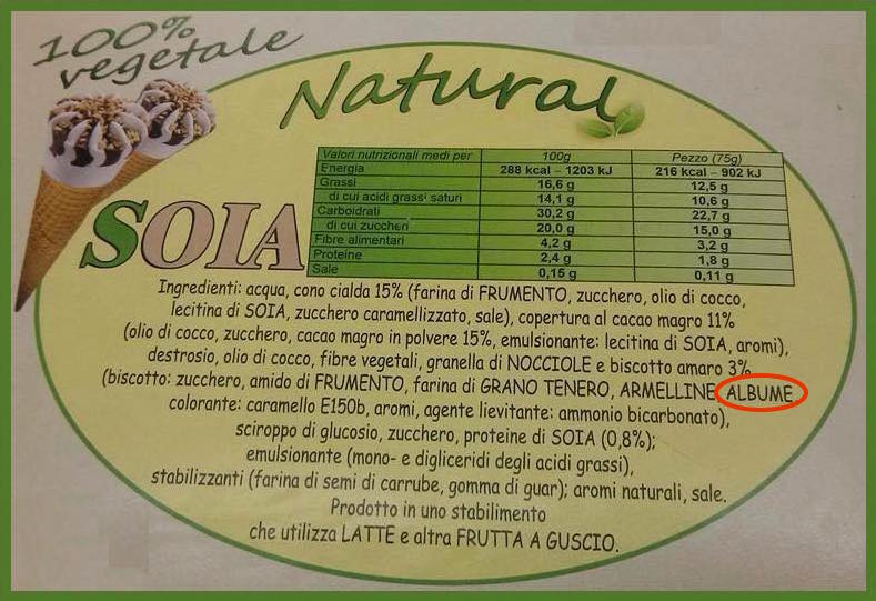 Vorrei segnalare l’etichetta di un gelato (vedi foto sotto) che sulla confezione viene presentato come 100% vegetale, ma in realtà leggendo la lista degli ingredienti si scopre contenere albume! Com’è possibile?