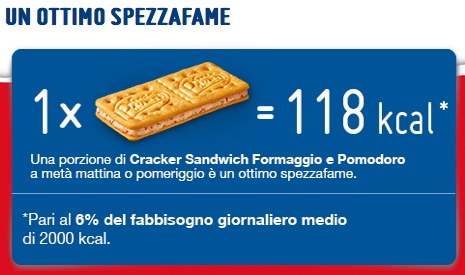 Lo snack è costituito da due cracker intrammezzati da una crema al formaggio in due gusti, solo formaggio oppure formaggio, pomodoro e origano: 23 grammi di prodotto per avere un rompi digiuno o una merenda leggera nel senso letterale della parola. Le diciture sulla confezione dicono che una vita sana prevede il “variare spesso i cibi… e seguire uno stile di vita fisicamente attivo…” . Il consiglio si abbina con l’indicazione dell’occasione ottimale per il consumo (metà mattina o pomeriggio) e con la funzione (snack nutriente).