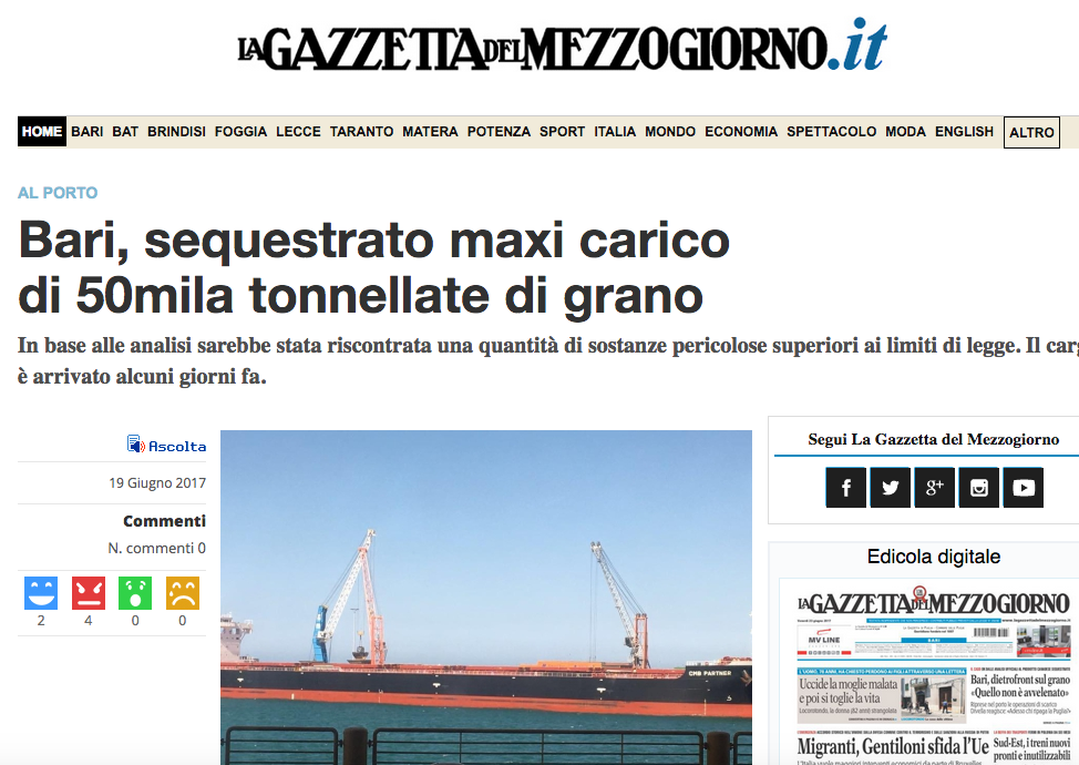 50 mila tonnellate di grano duro canadese sequestrate a Bari perché contaminato da deossivalenolo (DON). Così titolavano alcuni quotidiani pochi giorni fa in occasione dell’ennesima manifestazione di Coldiretti nei porti della Puglia. La realtà è leggermente diversa. Le analisi ufficiali sui campioni prelevati dai Carabinieri Forestali in quell’occasione smentiscono le notizie diffuse dai media, visto che il carico di grano canadese esaminato rispetta perfettamente i limiti europei per i contaminanti ed è sicuro. Vengono così ribaltati i risultati dei primi test, che avevano portato al sequestro del carico, rilevando un quantitativo di DON oltre i limiti di legge. La seconda notizia è che le prime analisi erano state svolte da un laboratorio non accreditato per questo tipo di test, quindi con una validità a livello legale pressoché nulla.