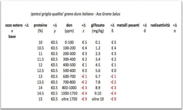 Il primo punto critico riguarda i laboratori che hanno effettuato le analisi e i criteri seguiti. GranoSalus parla di un laboratorio europeo accreditato ma non indica il nome. Andando oltre, quando dai proclami si passa ai fatti, si scopre che l’unica iniziativa concreta dell’associazione sia la presentazione di una proposta di “griglia di qualità di grano duro” presentata all’audizione davanti alla IV Commissione Regionale della Regione Basilicata. Questa tabella contempla indicazioni rispetto alla classificazione del grano duro, in relazione al contenuto contaminanti di “DON” e “glifosato” e ai limiti consentiti dalla legge italiana. C’è però un elemento che sorprende. I parametri indicati nella tabella relativi alla presenza di DON e glifosato, sono tali per cui tutte le aziende su cui sono stati fatti i campionamenti, e che l’associazione aveva giudicato negativamente (vedi giudizio nell’ultima colonna di sinistra della tabella 1) rientrano nella fascia virtuosa.
