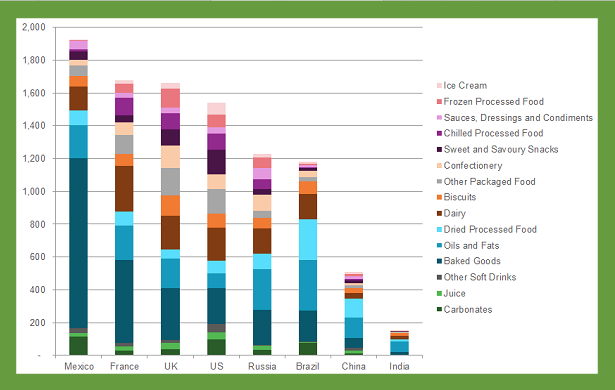 Secondo una ricerca di Euromonitor International, a livello mondiale le calorie provenienti da cibi confezionati e bevande zuccherate assunte ogni giorno, ammontano a circa 1,5 trilioni, con una media individuale di 765 calorie, che in Europa e Nord America sale a 1.500 e in Cina scende a 510. In testa alla classifica c’è il Messico, con una media di 1.919 calorie per persona, mentre in coda c’è l’India, con 151, sempre in riferimento ad alimenti confezionati e bibite.