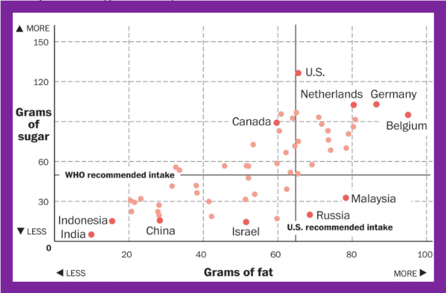 Per quanto riguarda il consumo di zucchero, a fronte di una dose giornaliera consigliata dall’Organizzazione mondiale della sanità pari a 50 grammi, che una nuova proposta vorrebbe dimezzata, gli Stati Uniti guidano la classifica con 126 grammi, seguiti da Germania e Olanda, con quasi 103 grammi. L’Italia è al 24° posto, con 57,6 grammi giornalieri.