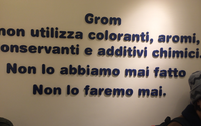 Due anni fa abbiamo chiesto a Grom, ossia a Guido Martinetti, patron della catena di gelaterie, di togliere dai punti vendita i manifesti, i depliant e le scritte su muri in cui si dice che “Grom non utilizza coloranti, aromi, conservanti e additivi chimici. Non lo abbiamo mai fatto e non lo faremo mai”, ritenendola una pubblicità scorretta e ingannevole.