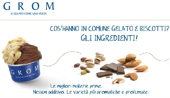 “A seguito del nostro ultimo articolo sul marketing della catena di gelaterie Grom – ci scrive un lettore – mi sembra che la polemica sia fondata sul nulla e lo dimostrate voi stessi anche in questo articolo: prima riportate la frase intera corretta “Grom non utilizza coloranti, aromi, conservanti e additivi chimici.” poi quando vi fate la domanda fatidica, riportate solo una parte e mette i puntini sul resto: “Ma se gli additivi che usa Grom sono almeno tre, perché le scritte sui muri (vedi foto sotto) dicono che “Grom non utilizza coloranti, aromi e additivi chimici…”?