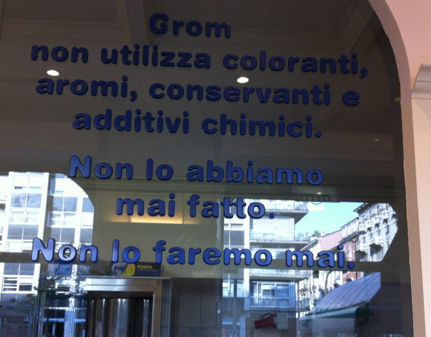 Utilizzare ottimi ingredienti – come dichiara Grom – non vuol dire necessariamente fare il gelato migliore, questa equazione non ha senso. Basta ricordare che la miscela viene preparata a Mappano in Piemonte, congelata è trasferita nei vari punti vendita per essere mantecata e messa in vaschetta. Chiunque conosca il gelato artigianale sa che Grom è una catena molto efficiente quando bisogna fare marketing, ma che si tratta di una struttura industriale in grado di produrre il migliore gelato simile a quello artigianale. C’è un altro elemento che considero una forma di pubblicità scorretta. La frase scritta a caratteri cubitali sulle pareti di alcune gelaterie (Grom non utilizza coloranti, aromi, conservanti e additivi chimici. Non lo abbiamo mai fatto e non lo faremo mai) non credo sia veritiera.