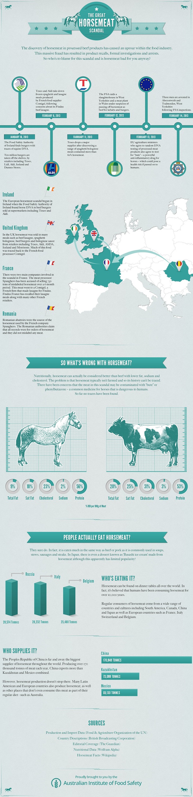 La cronologia dello scandalo della carne di cavallo è ben rappresentata in un’infografica proposta dall’Istituto australiano che si occupa di sicurezza alimentare (Mike Stewart, Australian Institute of Food Safety).