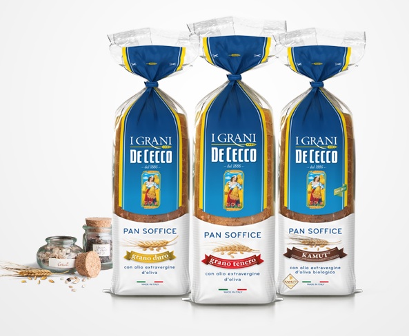 Presto arriverà sugli scaffali una linea di prodotti De Cecco destinati a sostituire il pane. La linea si chiama “I Grani De Cecco” e ogni tipologia di pane si presenta in una confezione elegante, con una fascia bianca sulla quale campeggiano i colori azzurro e giallo tipici dell’azienda. Si tratta di un packaging che richiama abbastanza le confezioni di pasta biologica.