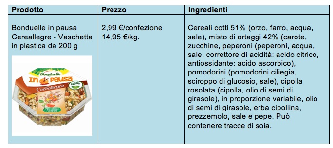 Questo “In pausa” mi sembra interessante dal punto di vista commerciale; se il consumatore (la consumatrice: il target si palesa femminile) riterrà che non gli INGREDIENTI, ma il SERVIZIO che viene proposto vale i 3 EUR, perchè risparmia la fatica di cuocere due cereali integrali, mondare e affettare le verdure (poi c’è la versione con tonno o pollo – da cuocere), rosolare la cipolla condire, mescolare e mettere in un recipiente ermetico, il prodotto avrà successo, altrimenti sarà un flop.