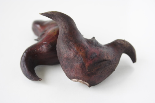 È la castagna d’acqua, il frutto della Trapa bicornis, una pianta della famiglia delle Trapaceae. Da non confondere con le castagne d’acqua cinesi che invece sono i bulbi commestibili di un’altra pianta la Eleocharis dulcis.