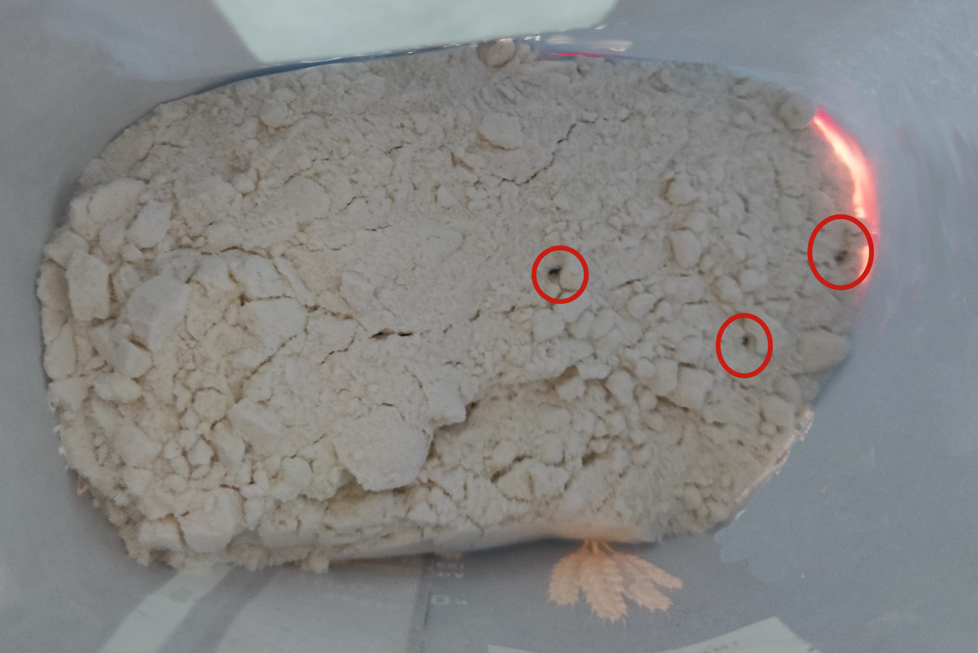 “Per quanto riguarda la farina, dalla foto (vedi sotto, ndr) è difficile a dirsi, ma potrebbe trattarsi di Tribolium o di Oryzaephilus, insetti che infestano facilmente alimenti polverosi”
