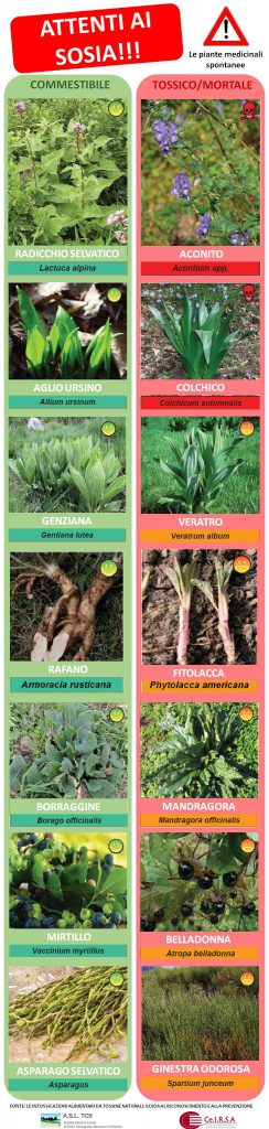 Anche il Centro Antiveleni di Milano, l’ATS della Brianza e l’IZSLER, in collaborazione con il Ministero della Salute, la Regione Lombardia e l’Ospedale Niguarda, hanno pubblicato nel 2016 un interessante documento dal titolo “Le intossicazioni alimentari da tossine naturali: guida al riconoscimento e alla prevenzione“. La guida, destinata a cittadini, operatori del settore e studenti, illustra quali alimenti in natura possono essere dannosi per la salute (funghi, piante, pesci, etc), suggerendo come comportarsi in caso di intossicazione e sulla corretta gestione degli alimenti in ambiente domestico. Nell’immagine sotto ci sono alcune piante tossiche che possono essere scambiate per piante commestibili.