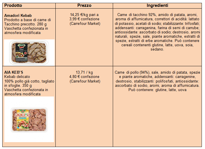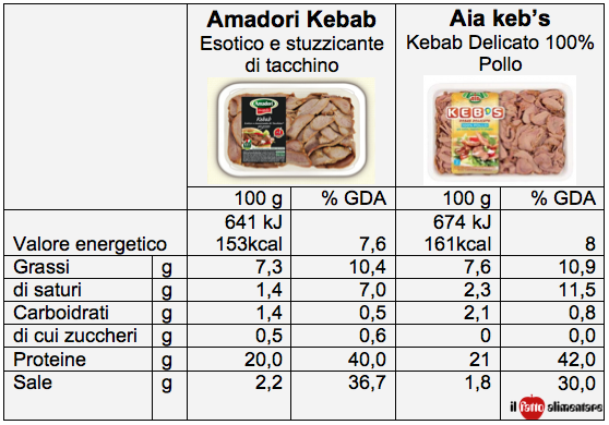 Il kebab rientra in una nuova categoria di prodotti di piatti di carne pronti da mangiare che possiamo comprare al supermercato. La nostra analisi ha interessato i prodotti di due marche leader: Aia e Amadori. Premesso che nella tradizione culinaria per kebab si intende un piatto di carne accompagnato da carboidrati, molto diffuso in Turchia, nel bacino mediterraneo e da anni anche in molti paesi europei.