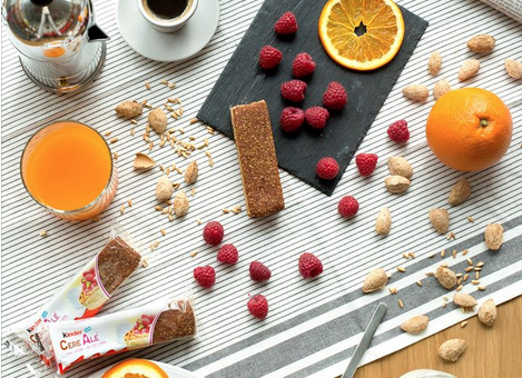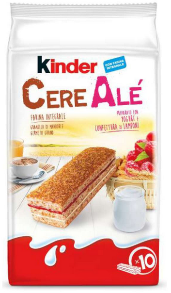 (1) Ingredienti di Kinder CereAlé: confettura di lamponi 15,5% (purea di lampone, sciroppo di glucosio-fruttosio, zucchero, gelificante: pectina, acidificante: acido citrico) zucchero, farina di frumento, farina di frumento integrale 7,5% (farina di frumento, cruschello di frumento), tuorlo d’uovo, olio di palma, yogurt concentrato 5%, olio di girasole, fiocchi macinati (3,4%) di: riso, orzo, segale, avena, frumento; glutine di frumento, mandorle 2,5%, proteine del latte, lievito di birra, destrosio, lattosio, aromi, emulsionanti (mono e digliceridi degli acidi grassi), germe di grano 0,7%, farina di riso, panna fresca pastorizzata, cacao magro, sale, albume d’uovo in polvere.
